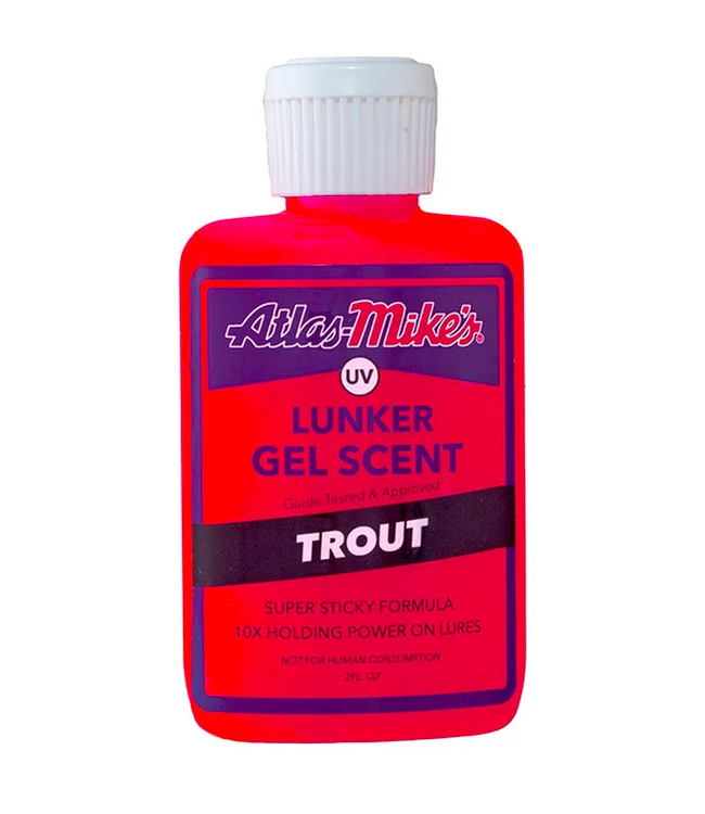 Atlas Mike’s UV Lunker Gel Scent – Trout. Atlas Mike’s UV Gel Scent comes from over 25 years of testing and research. Our special blend of concentrated scents, flavors and amino acids combined with our Super Sticky formula creates a great fish attractant. Apply directly to lures, spinners, plastic baits, tube jigs, etc. You will notice the results immediately. The super sticky formula holds on lures and baits longer, resulting in more strikes and more fish! Effective in both fresh and saltwater. Available in 25 color/scent combinations, so you’re sure to find what you need!